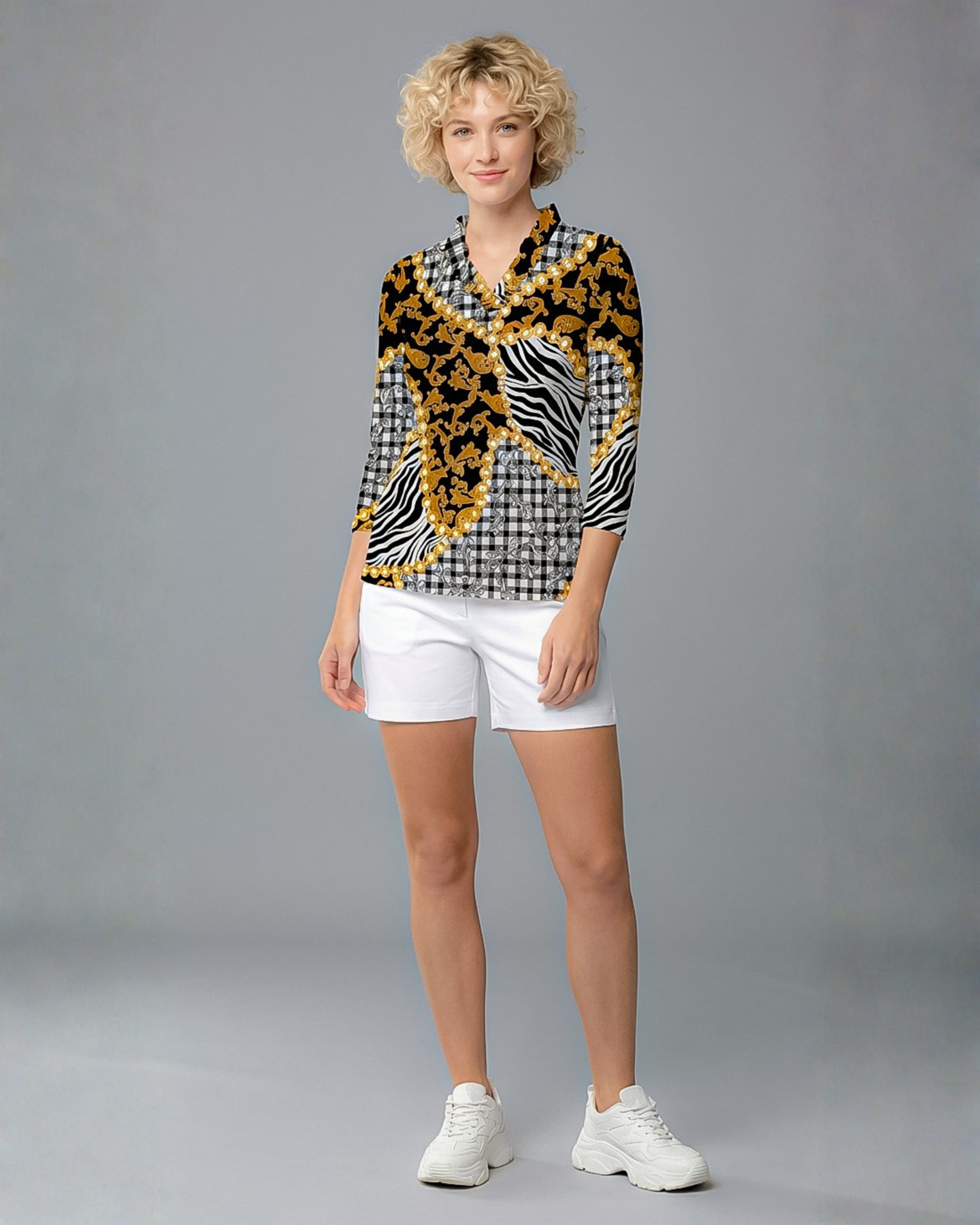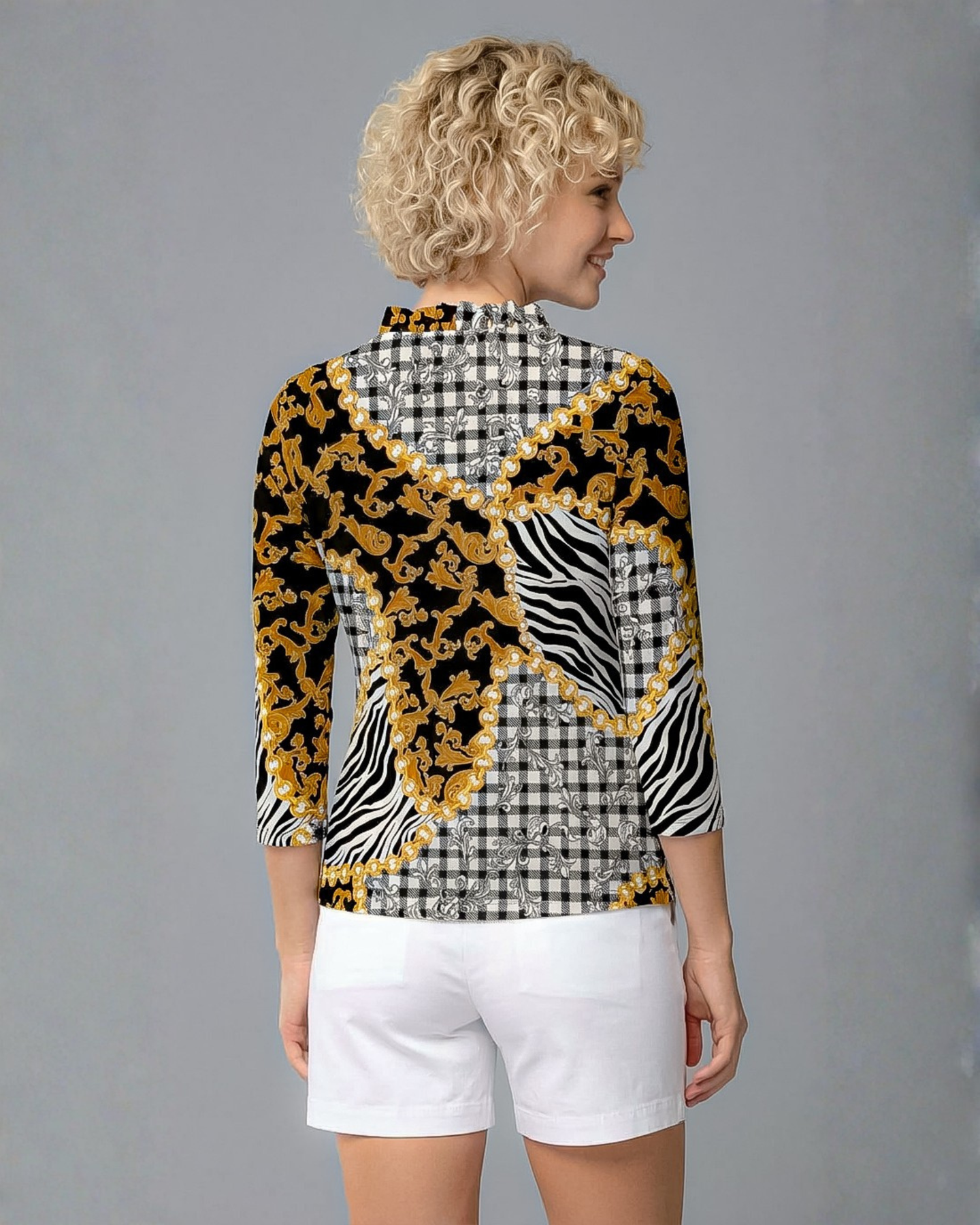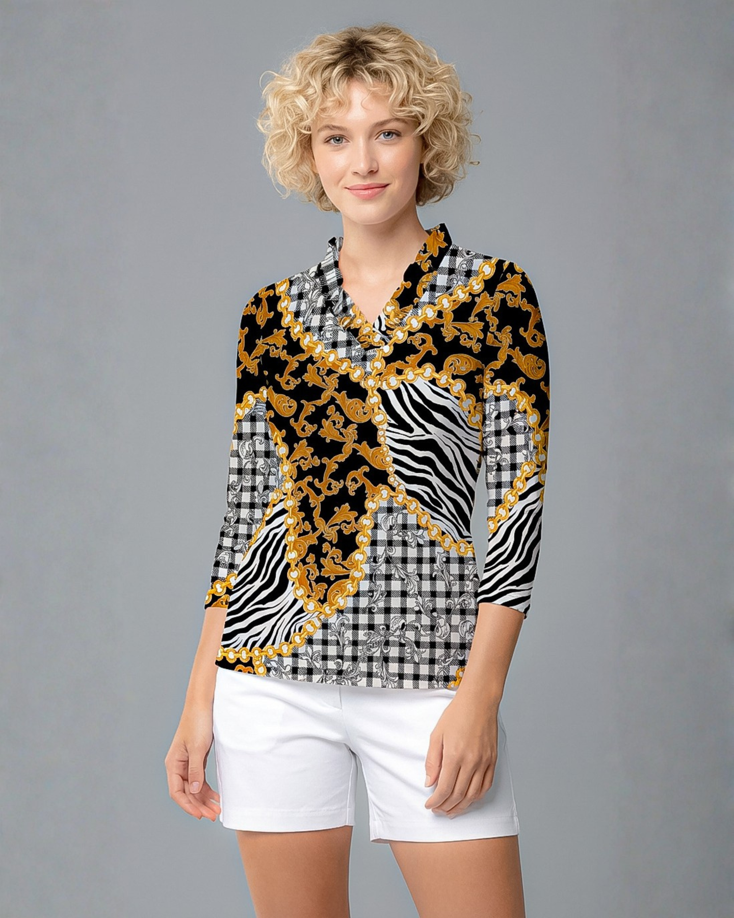 This sophisticated design print is a masterpiece that enhances your personality and makes you look elegant and cheerful. The combination of baroque art with madras check sets the ground for the eyes. A spark of wildness with zebra skin has created life in the print.