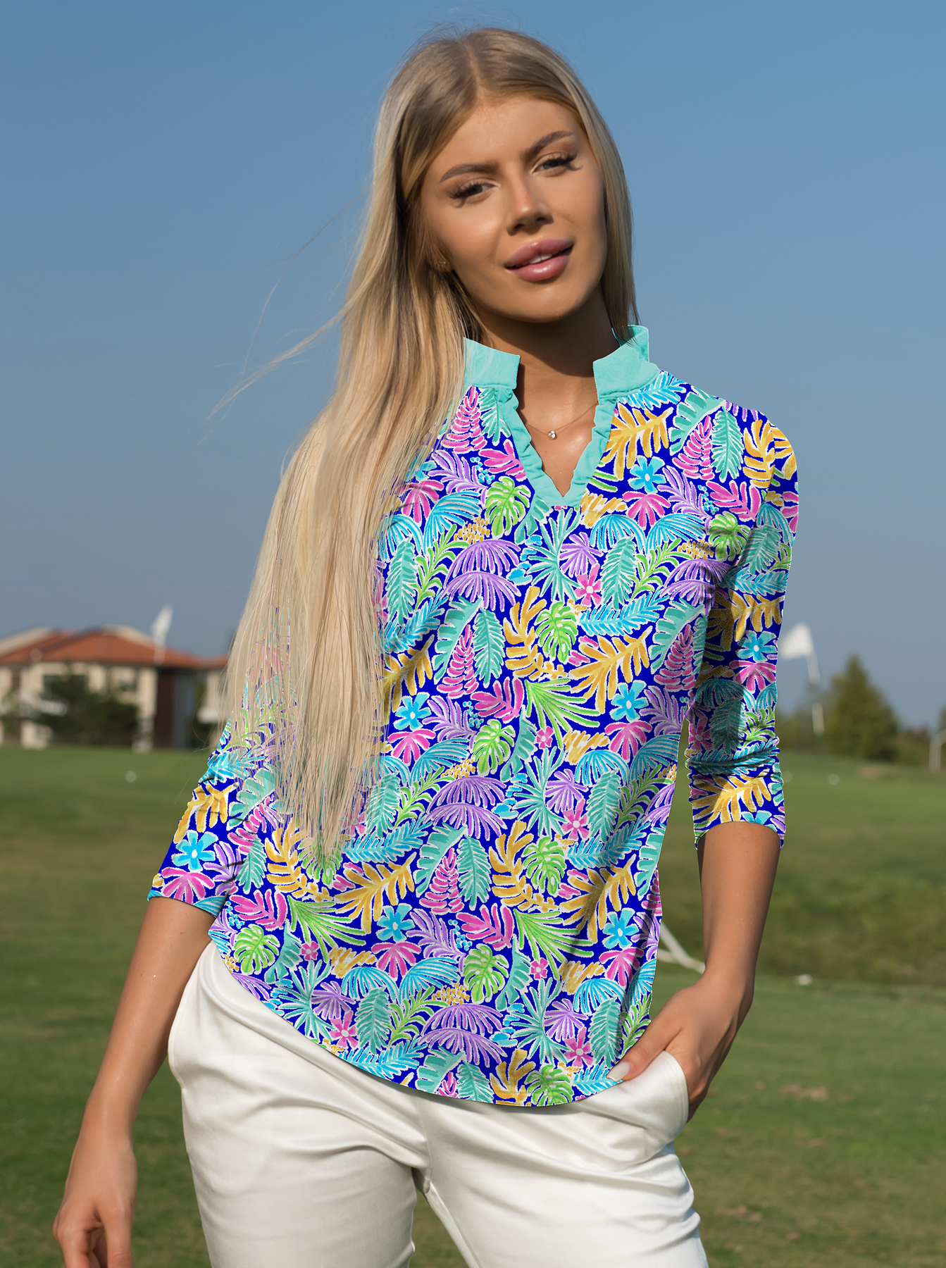 Tropical leaves set a mood for outdoor activities like golf, tennis, and picnics. Enjoy this print and feel energized.