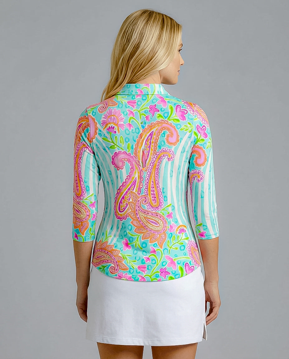 This dramatic print is a piece of art. The colorful paisley placement is focused with a background blissfully supportive to give the wearer a feeling of being calm and cozy.