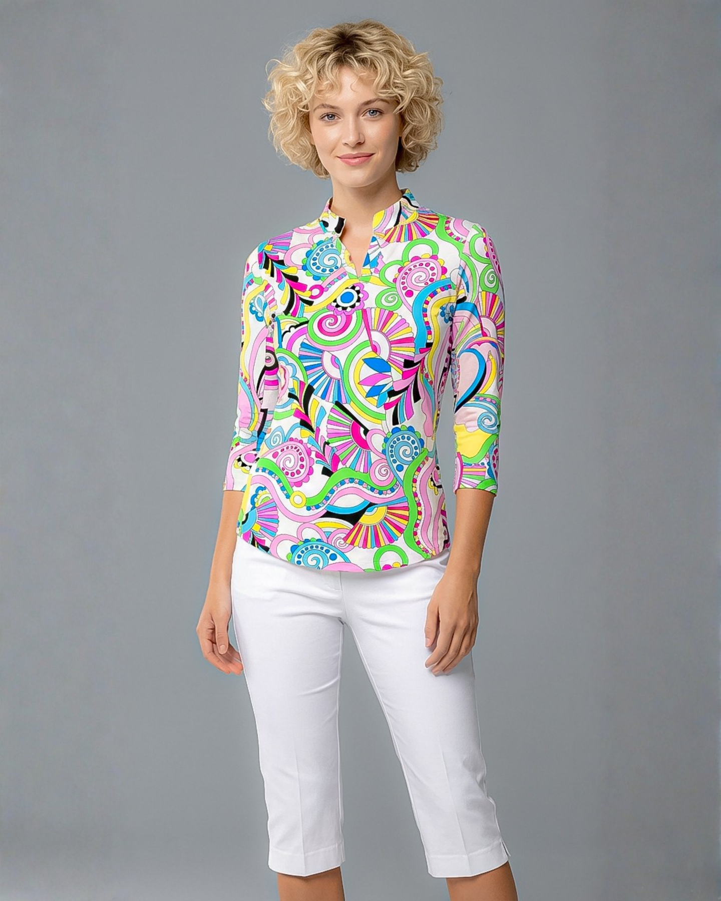 Desiree 3/4 Sleeve Ruffle Placket Mock Top 99Z53