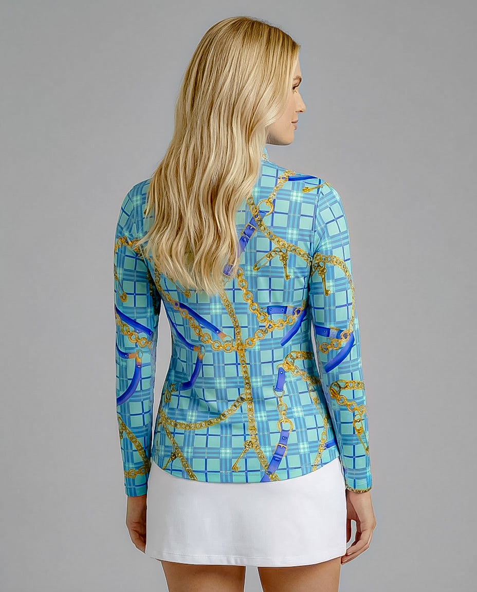 Beautiful designer checks the background with an ensemble of chains and belts that constitute class, beauty, elegance, and sophistication. Wear it at the golf course, at the tennis court, or just take a vacation at a distant resort. You look good where ever you go and where ever you are !!