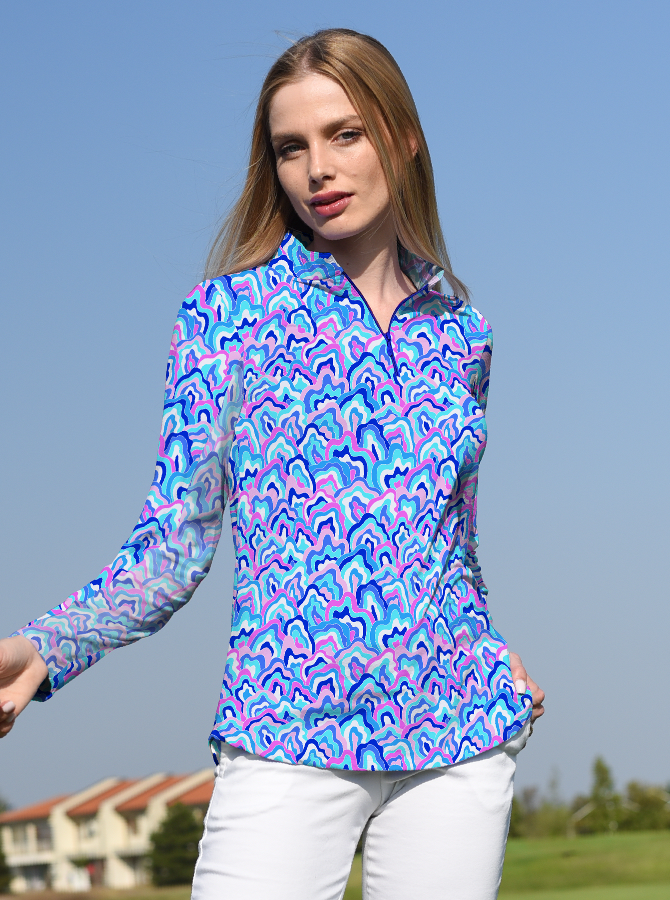 This energetic print features abstract, wave-like patterns in shades of blue, pink, and aqua. The flowing shapes resemble topographic lines or marbled water, creating a bold, sporty, and vibrant look — ideal for resort, golf, or activewear.