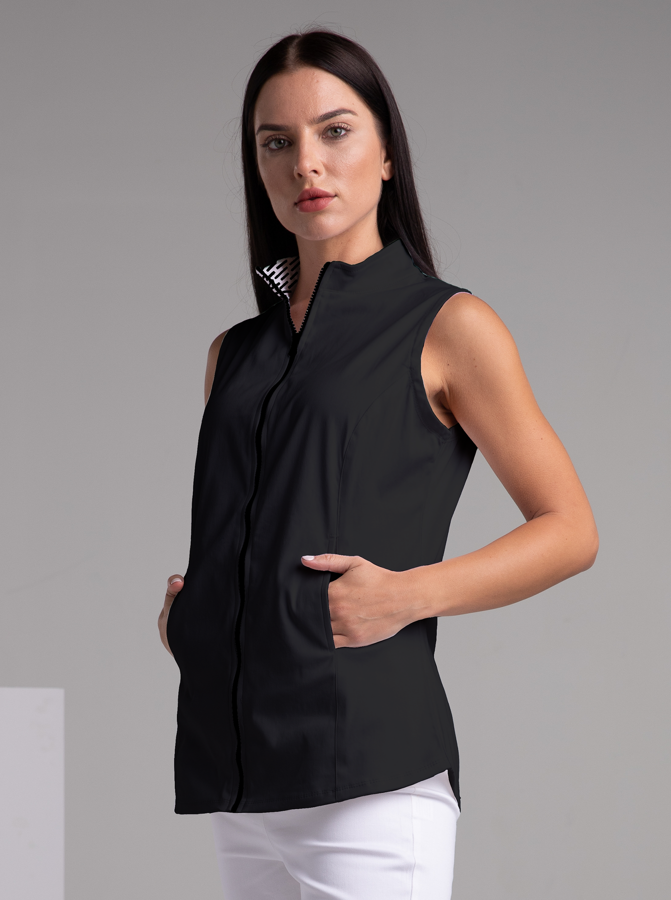 Introducing a versatile reversible vest jacket, perfect for any wardrobe. With a front zipper closure, this jacket offers two stylish looks in one: solid on one side and a vibrant print on the reverse. Elevate your style with this functional must-have piece!