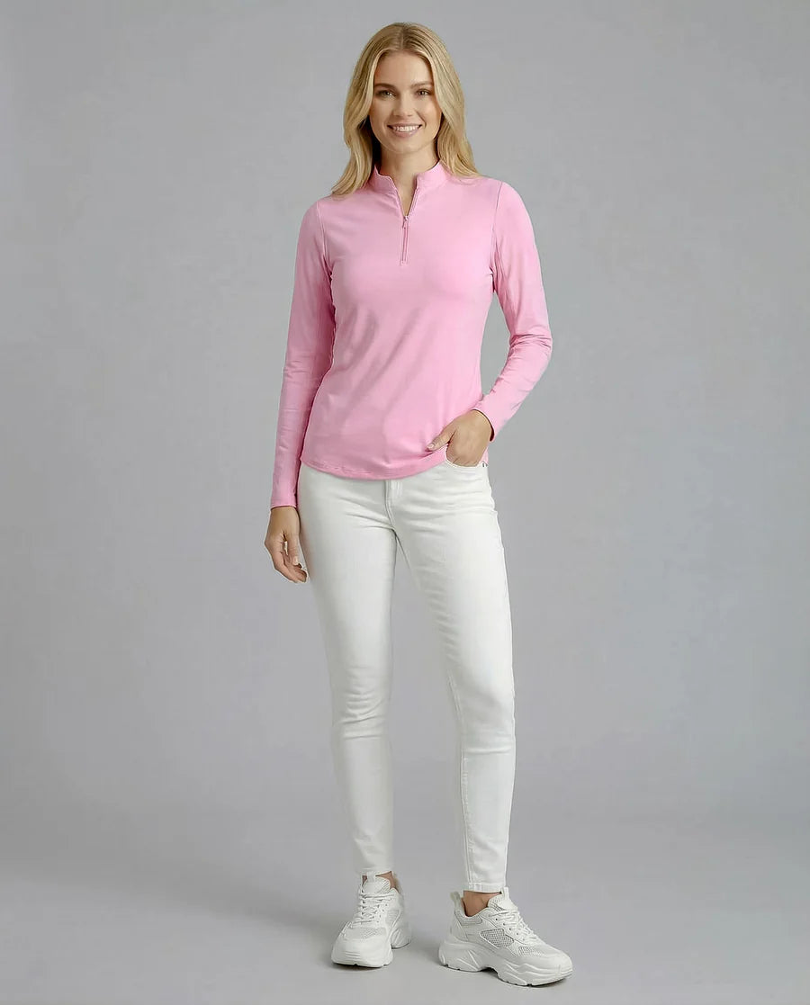 This mock zip neck with a swift slide-open front is sporty and stylish. Great for outdoor sports in the sun. Golfers, tennis players, horse riders, and vacationers at resorts love wearing this classic top. The functional fabric keeps you cool, and fresh and protects you from sun rays.